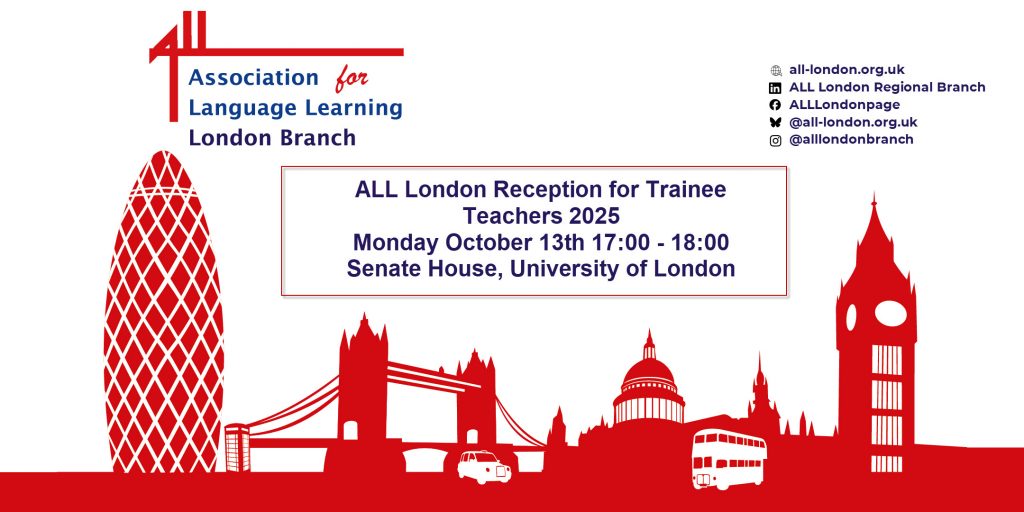 Are you a trainee teacher of languages – primary or secondary? Join us for a relaxed, sociable late afternoon hosted by the ALL London branch of the   Association for Language Learning (ALL) – your national subject association for language teachers.