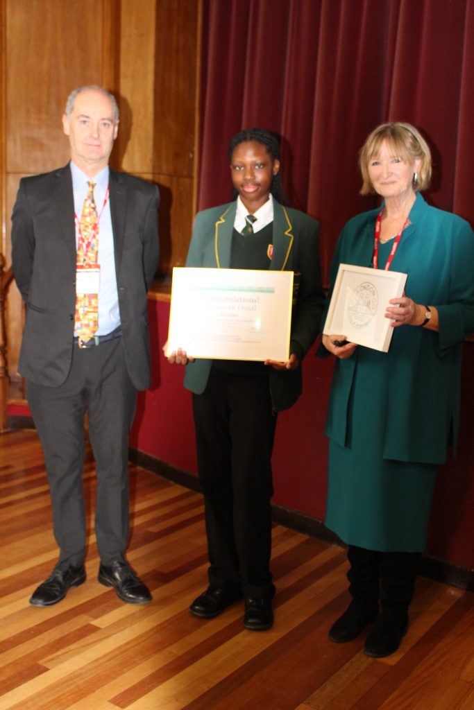 Bishop Thomas Grant School Ceremony. Left to right: Nick Mair (ALL London Vice Chair), Elizabeth (the winner!) and Helen Myers (ALL London Chair).
